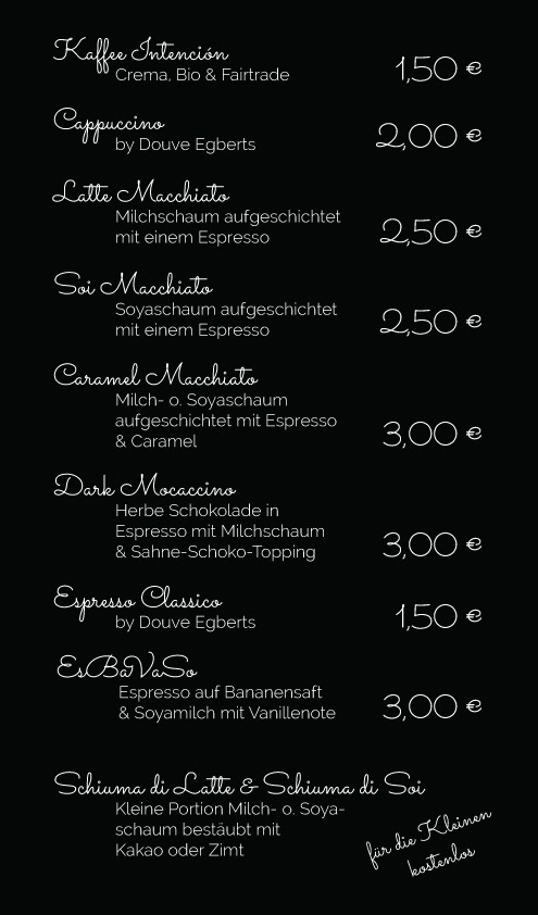 Hier findest du unser Kaffee-Sortiment (Gebäcke werden eine Woche vorher aktualisiert).
